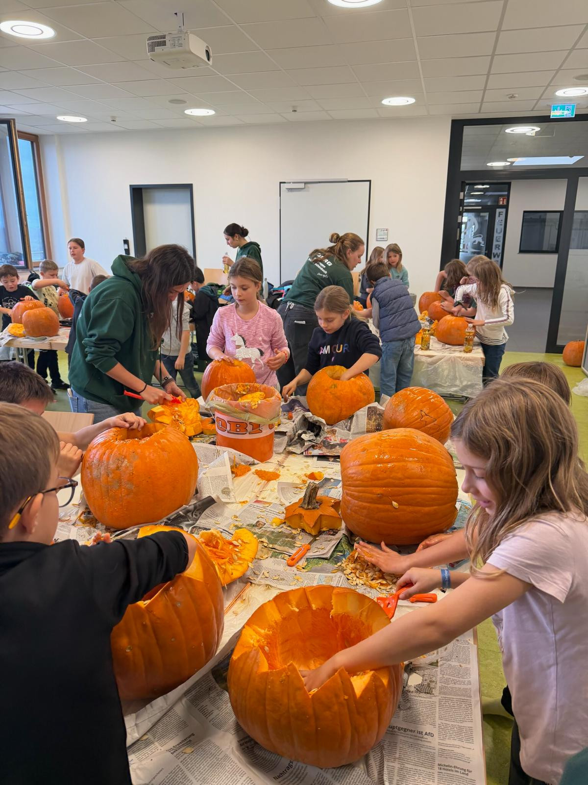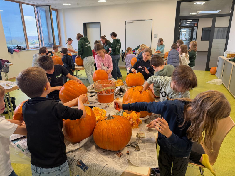 Am Samstag, den 25.10.2025, fand das diesjährige Herbstbasteln statt. Um 14.00 Uhr trafen sich 29 Kinder zwischen 5 und 10 Jahren mit 6 Betreuerinnen und Betreuern am Rettungszentrum. Im Seminarraum tummelten sich alle motiviert um die Gruppentische, doch die größte Frage war noch offen: Wo sind die Kürbisse? Nachdem wir mit einer kurzen Umfrage herausfanden, dass jedes Kind schon mal einen Kürbis geschnitzt hatte, wussten wir, dass wir es mit echten Profis zu tun hatten. Kurzerhand ging es also nochmal runter in die Garage, in der die Kürbisse lagerten. Jedes Kind durfte sich einen Kürbis aussuchen und nach einem kurzen Waschgang wurden die schweren Kürbisse ganz allein oder mit der Hilfe von Betreuern nach oben getragen.