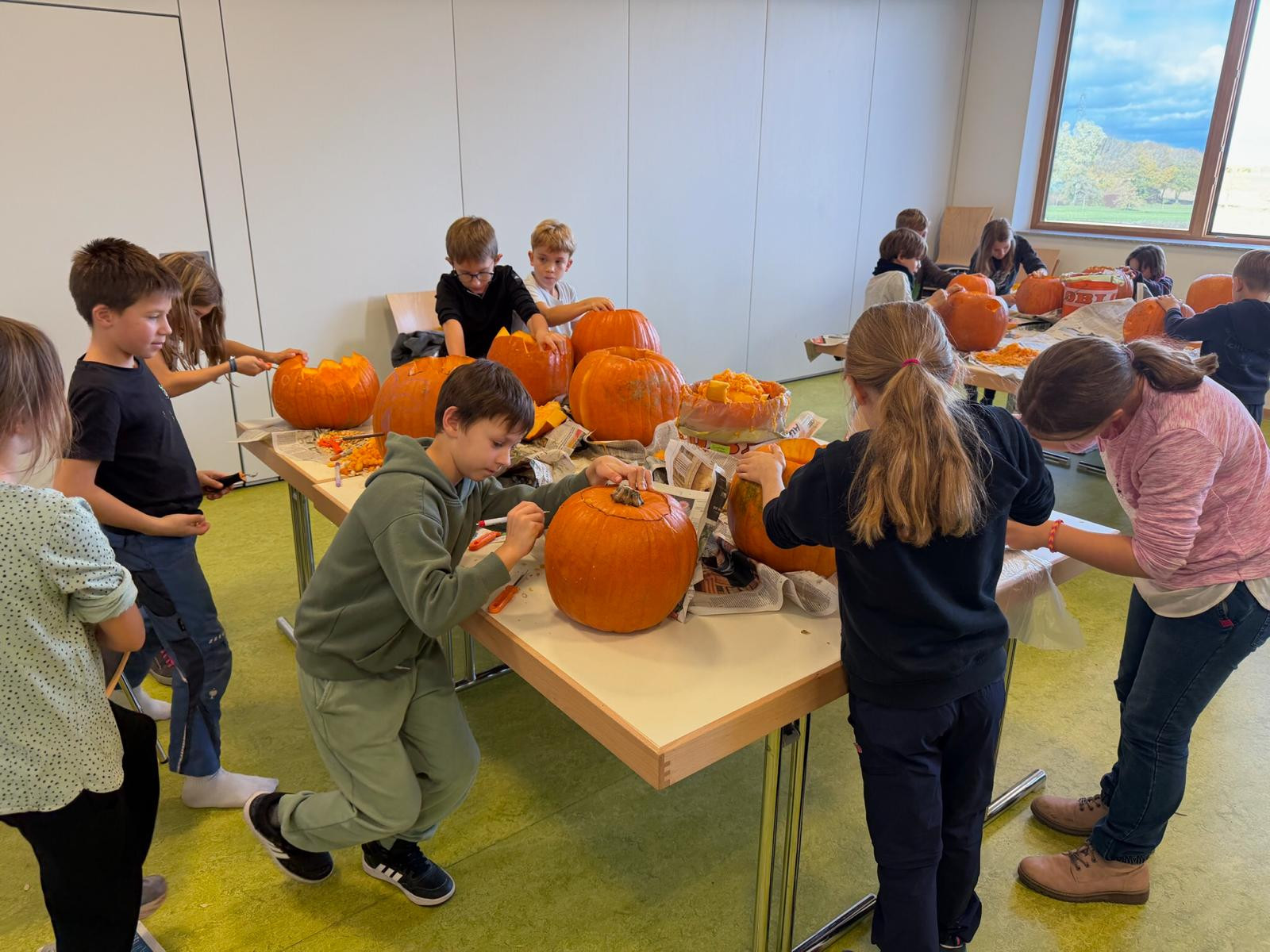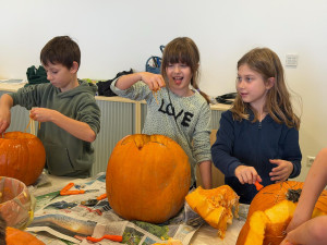 Oben ging es direkt los: mit Stiften wurden gruselige Gesichter aufgezeichnet und mit unseren Schnitzwerkzeugen wurden die ersten Deckel aufgeschnitten. Nachdem alle Kürbisse ausgehöhlt waren, wurde es spannend. Jedes Kind hatte eine eigene Vorstellung für den Kürbis. Es gab große und kleine, eckige und runde Augen und Münder, Zähne, Ohren, Narben und vieles mehr. Immer wieder wurde an den anderen Tischen geschaut und Inspirationen gesammelt.
